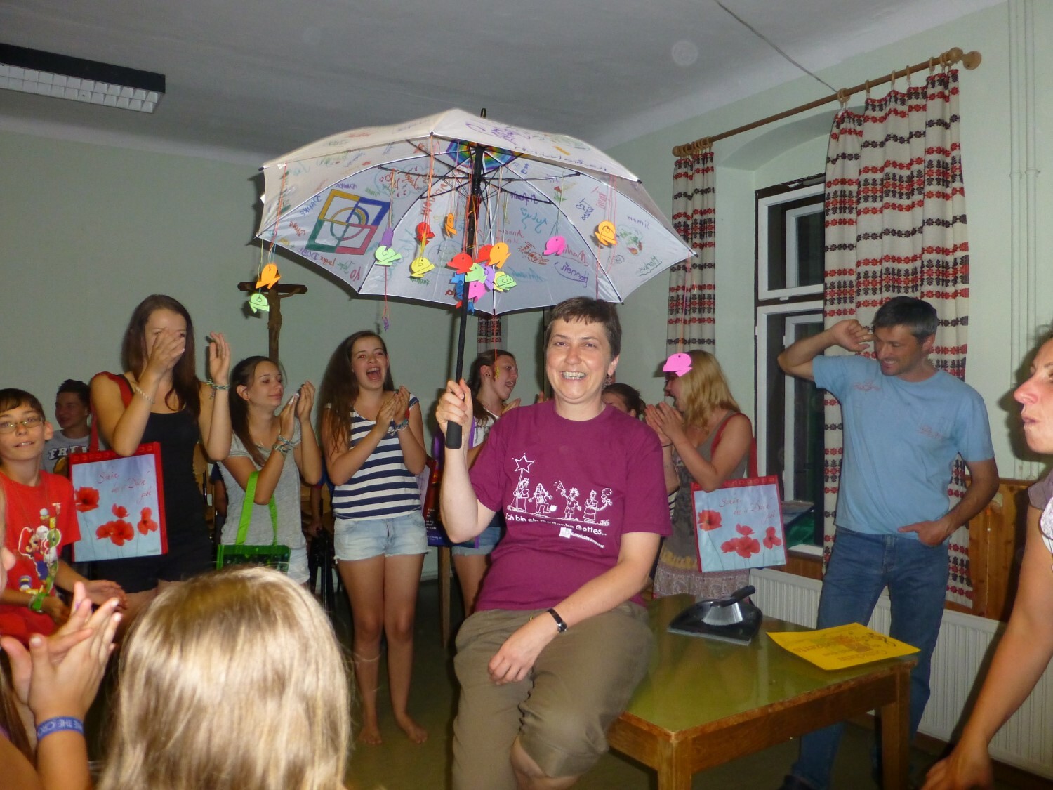 Sr. Maria bekommt als Geschenk einen bunt bemalten und behängten Regenschirm.