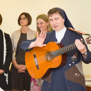 Sr. Maria spielt und singt „Jesus geht in die Stadt hinein“ bei der Palmprozession