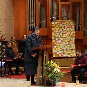 Sr. Maria steht der Karfreitagsliturgie vor. Wir feiern Ostern in der Mehrweckhalle Dobl-Zwaring.