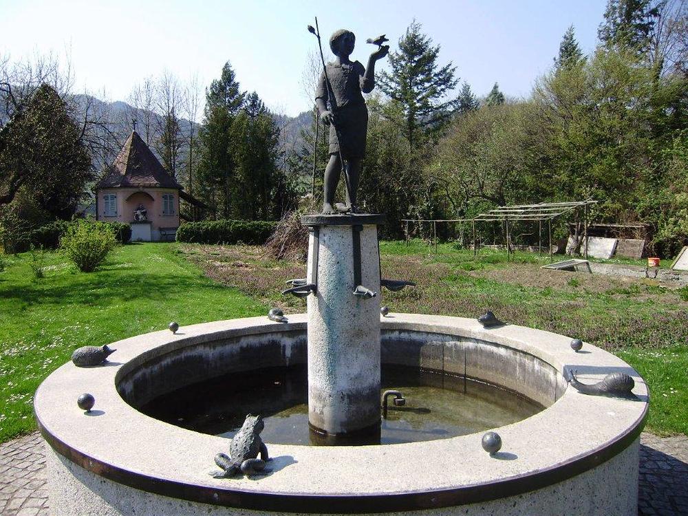 Der Franziskusbrunnen ist ein Kunstwerk unserer Zeit und dem Andenken des heiligen Franz von Assisi gewidmet. Der in der Zwischenzeit berühmt gewordene Akademische Maler Edwin Eder hat sich mit großem Engagement mehr als ein Jahr mit diesem Werk beschäftigt. So entstand eine Bronzeplastik eines jugendlich-revolutionär anmutenden Franziskus im Gespräch mit einem Vogel. Die Vogelpredigt ist eine bekannte Erzählung aus dem Leben des Heiligen, der bekanntlich ein großer Natur- und Tierfreund war. Unter den fünf am Brunnenrand postierten Tieren befindet sich auch ein durch Ölschlamm verendeter Schwimmvogel. Fünf kleine Weltkugeln, die das Tier-Pentagon am Brunnenrand unterteilen, zeigen auf jedem der fünf Kontinente einen Krater. Wunden, aus denen die Welt blutet. So entstand eine der wichtigsten plastischen Arbeiten des heimischen Künstlers.