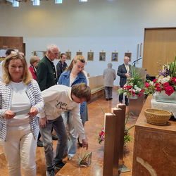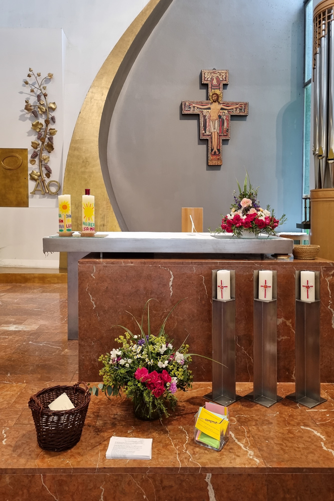 In der Zeichenhandlung waren alle eingeladen, zur Frage „Was kann ich aus Barmherzigkeit an meinem Nächsten tun?“ Kärtchen auszufüllen und diese dann vor dem Altar in einen Korb zu legen. Zum Mitnehmen standen Karten mit den einzelnen „Früchten des Geistes“ zur Auswahl bereit.