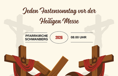 Jeden Fastensonntag vor der Heiligen Messe beten wir den Kreuzweg.Termine: 22. Februar 2026 01. März 2026 08. März 2026 15. März 2026 22. März 2026 Jeweils um 08 Uhr.